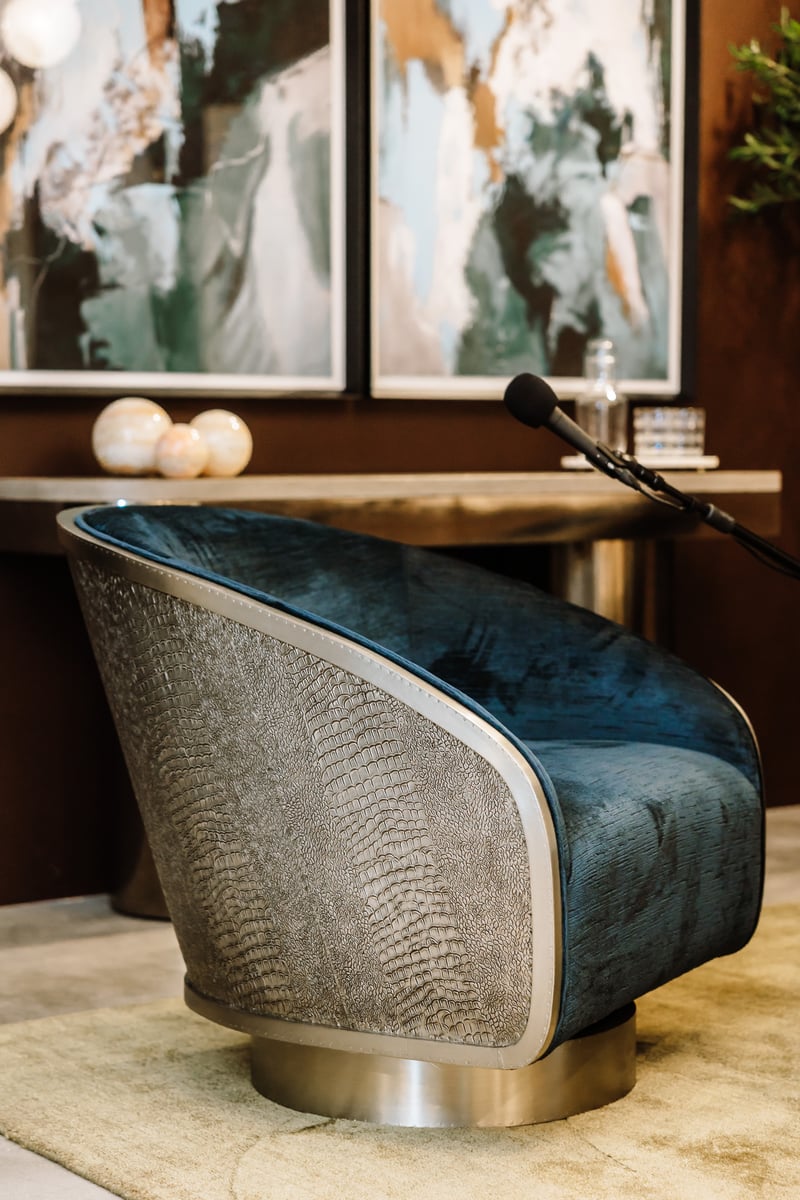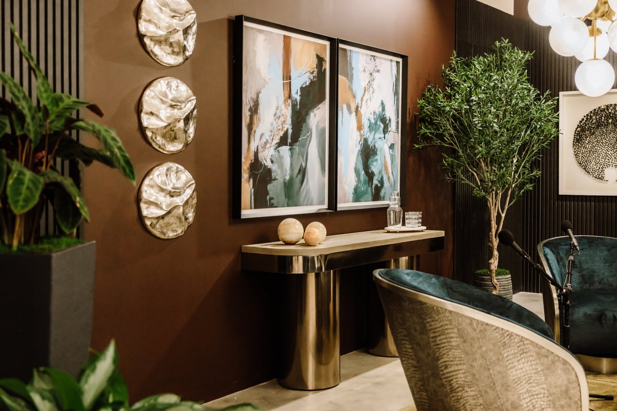 Outfitted with the Bernhardt Interiors Miles Swivel Chairs, Jacopo Cocktail Table and Jacopo Console Table, the space blends comfort and craftsmanship, creating an elegant backdrop for the authentic conversations shaping the future of the home and furnishings industry.