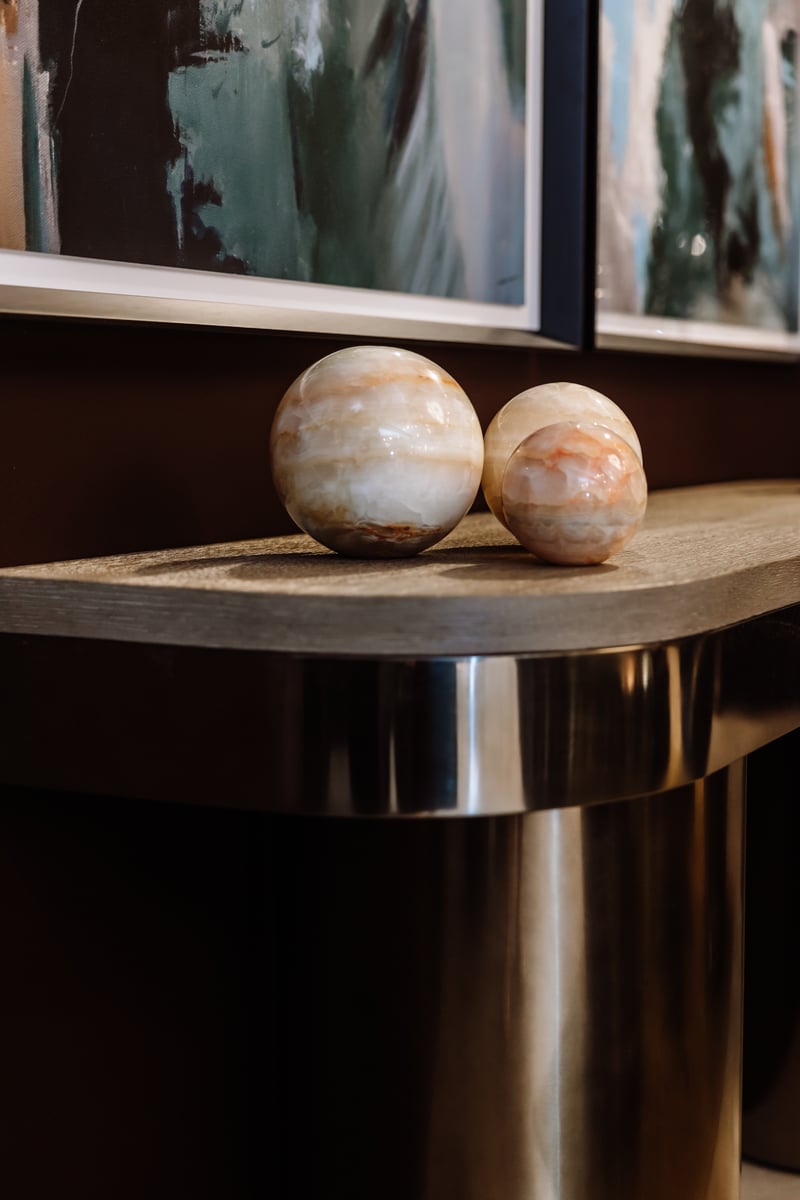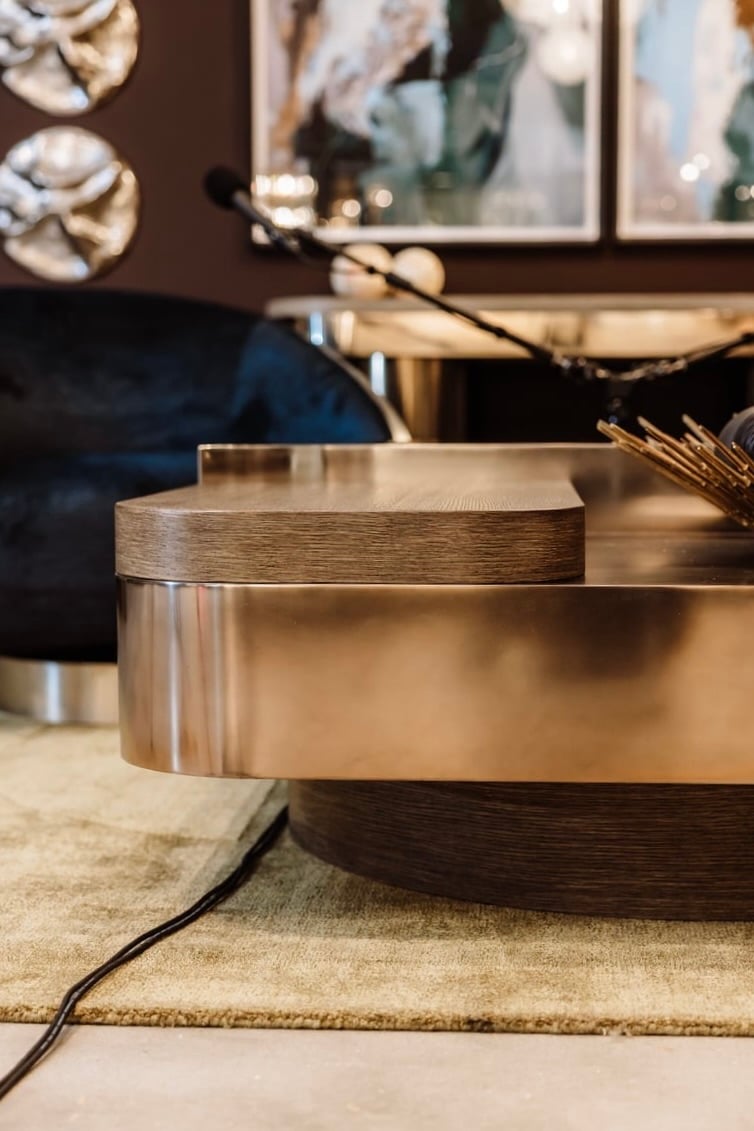 Layered materials craft a sculptural design for this cocktail table.